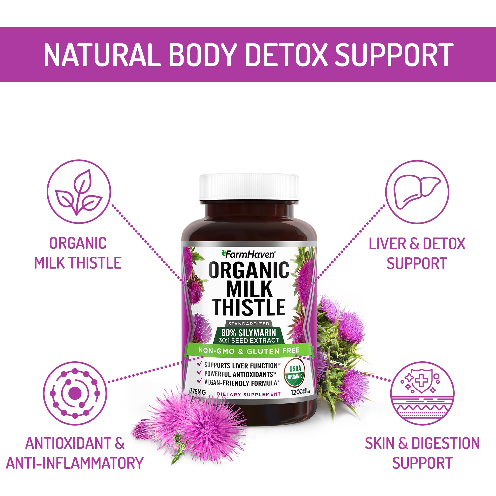 The benefits of this purple flower come from Silymarin, an active compound found within Milk Thistle seeds. That is why taking a supplement that is standardized to a specific Silymarin content like FarmHaven's is crucial for full effectiveness.